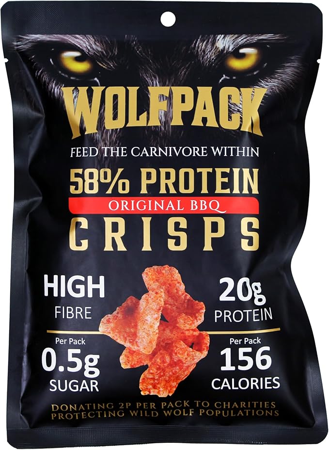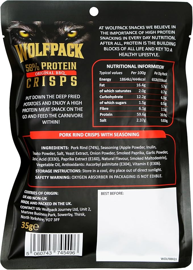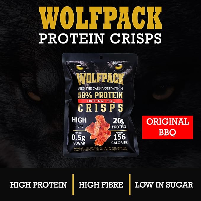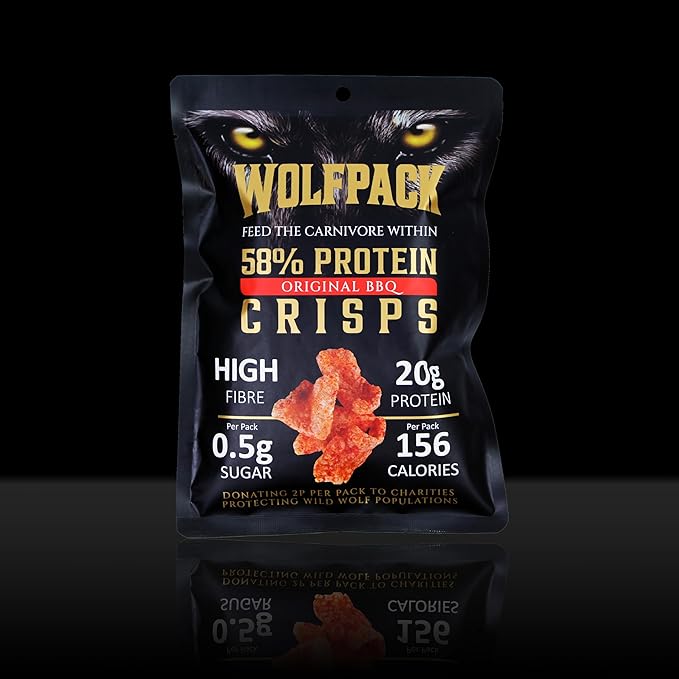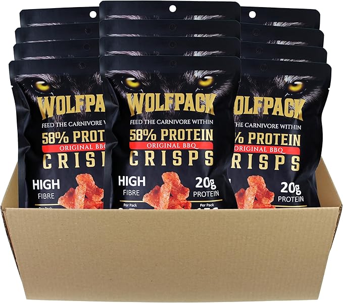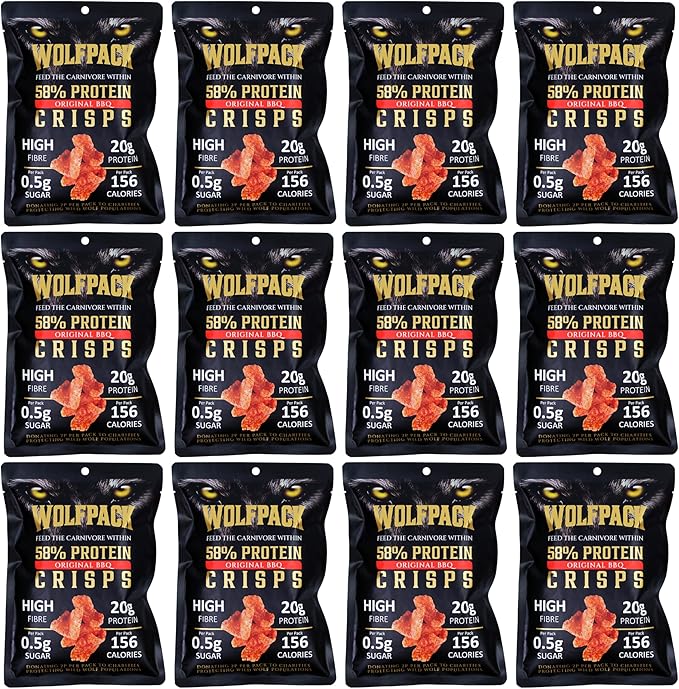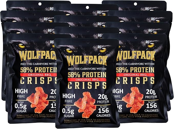 Indulge your cravings without compromising on your lifestyle goals with Wolfpack - Original BBQ crisps. Perfectly crafted for those who cherish the rich, savoury taste of bacon and pork rinds, these high-protein snacks offer a delightful crunch in every bite. Each box contains conveniently packed 35 g bags, making it easy to enjoy these low-calorie treats wherever you go. Designed for those embracing low-carb, high protein diets similar to keto, Wolfpack crisps are a flavourful alternative to traditional snacks like beef jerky, traditional crisps, scampi fries and pork scratchings. Wolfpack BBQ crisps are not only delicious but also align with healthy eating choices. Carefully seasoned with mouth-watering BBQ flavouring reminiscent of smoked pork chops, every bite delivers ultimate satisfaction. Ideal as shareable snacks during social gatherings or solo indulgence moments at home or on-the-go, they complement other beloved options such as proper chips, traditional crisps or cooked meat selections. Why settle for ordinary when you can satisfy your taste buds with extraordinary indulgences? Elevate your snacking experience today by diving into these irresistible BBQ bites; the perfect marriage of crunchy goodness meeting nutritious sustenance; a true revelation in healthy snacks for adults juggling busy lives and families prioritizing nutritious pantry staples!